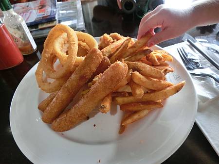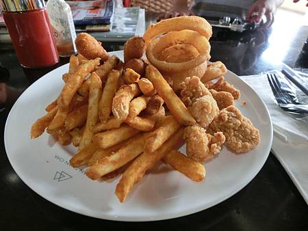 超大一份美式綜合炸物包含洋蔥圈.雞米花.薯條.起士條